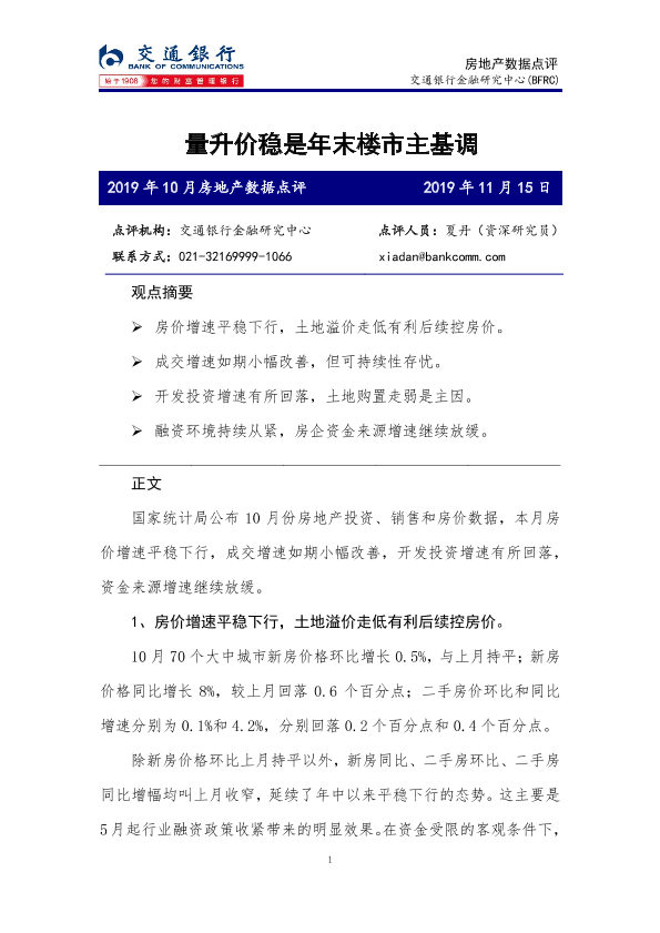 【交通银行金融研究中心】【20191115】2019年10月房地产数据点评:量升价稳是年末楼市主基调-6页