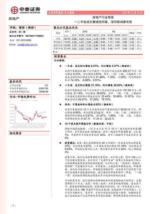 【中泰证券】【20191116】房地产行业周报:一二手房成交量继续回暖,深圳取消豪宅税-18页