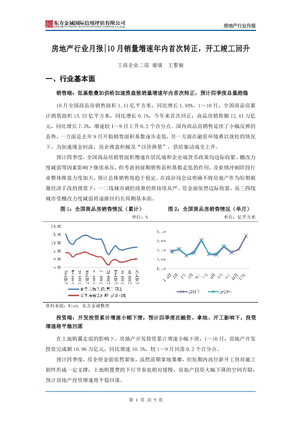 【东方金诚】【20191120】10月销量增速年内首次转正,开工竣工回升-5页