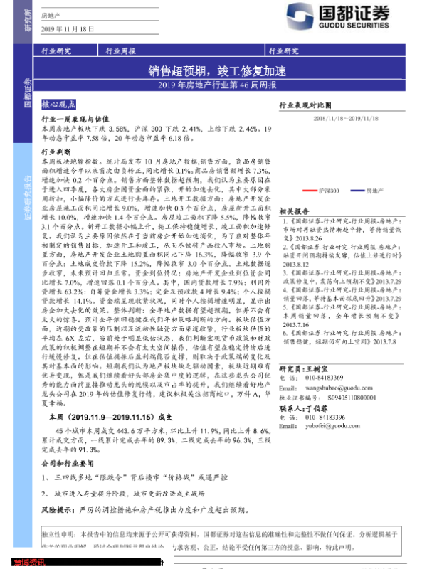 【国都证券】【20191118】2019年房地产行业第46周周报:销售超预期,竣工修复加速-18页