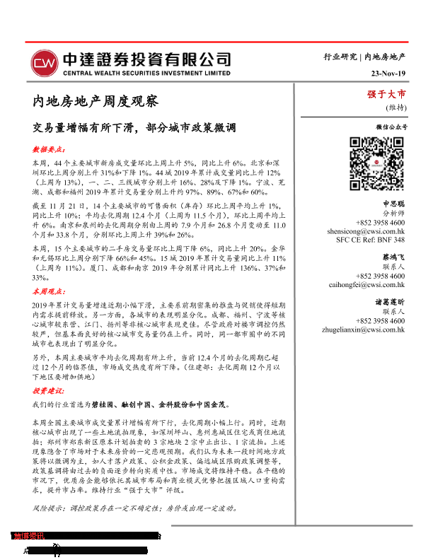 【中达证券】【20191123】内地房地产周度观察:交易量增幅有所下滑,部分城市政策微调-12页