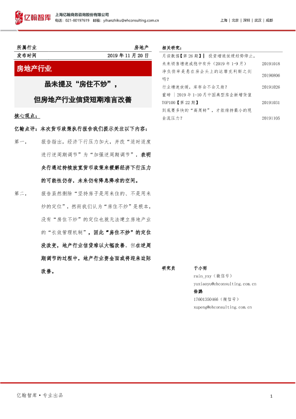 【上海亿翰商务咨询股份有限公司】【20191120】虽未提及“房住不炒”,但房地产行业信贷短期难言改善-11页