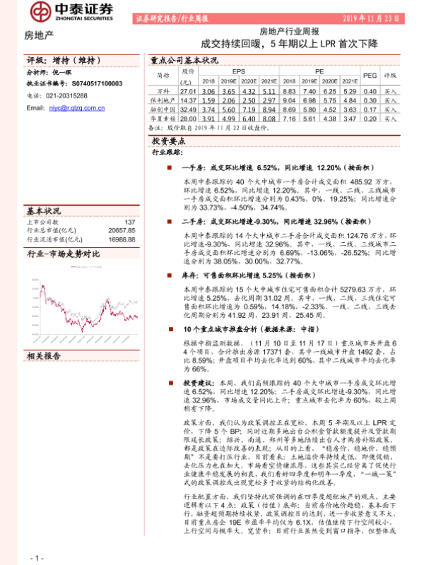 【中泰证券】【20191123】房地产行业周报:成交持续回暖,5年期以上LPR首次下降-20页