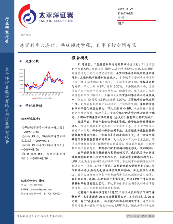 【太平洋证券】【20191129】地产行业:房贷利率六连升,年底额度紧张,利率下行空间有限-8页