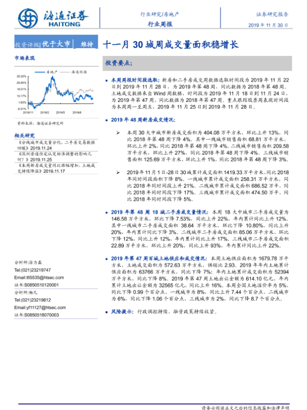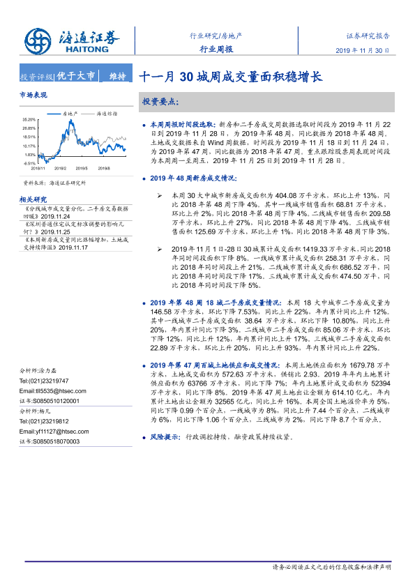 【海通证券】【20191130】房地产行业周报:十一月30城周成交量面积稳增长-6页