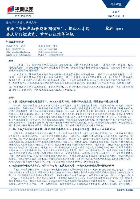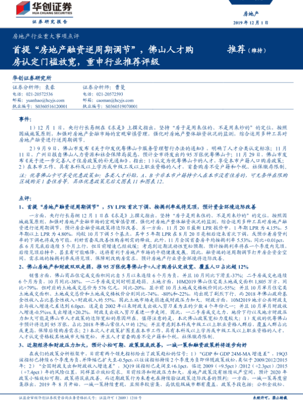 【华创证券】【20191201】房地产行业重大事项点评:首提“房地产融资逆周期调节”,佛山人才购房认定门槛放宽,重申行业推荐评级-9页