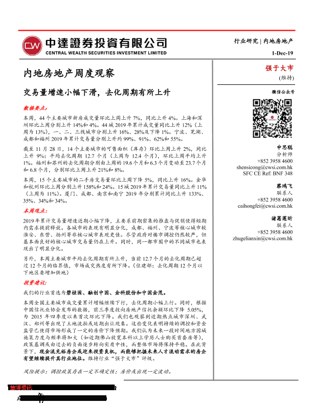 【中达证券】【20191201】内地房地产周度观察:交易量增速小幅下滑,去化周期有所上升-12页
