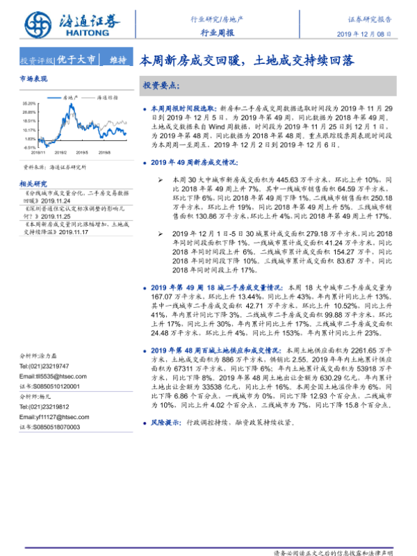 【海通证券】【20191208】房地产行业周报:本周新房成交回暖,土地成交持续回落-6页