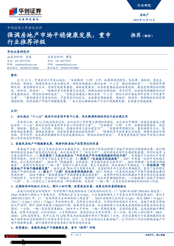 【华创证券】【20191213】强调房地产市场平稳健康发展,重申行业推荐评级-12页