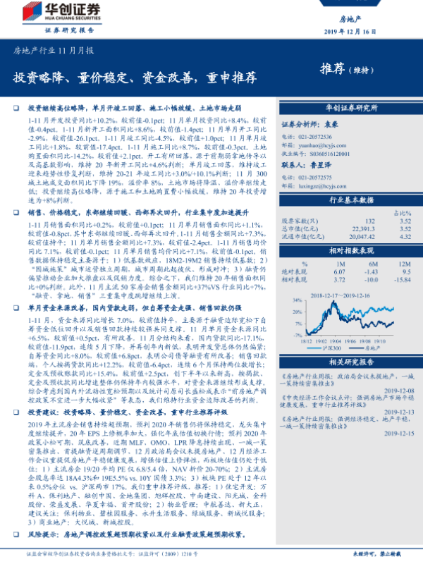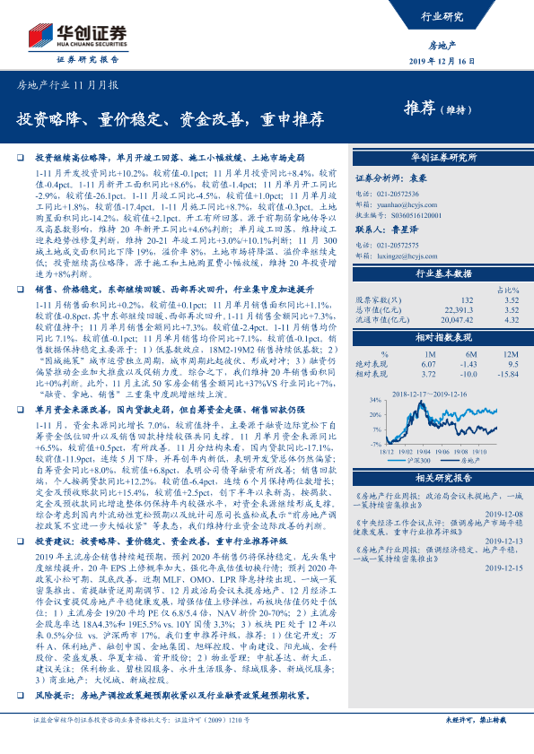 【华创证券】【20191216】房地产行业11月月报:投资略降、量价稳定、资金改善,重申推荐-15页