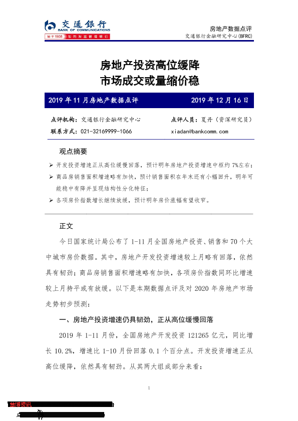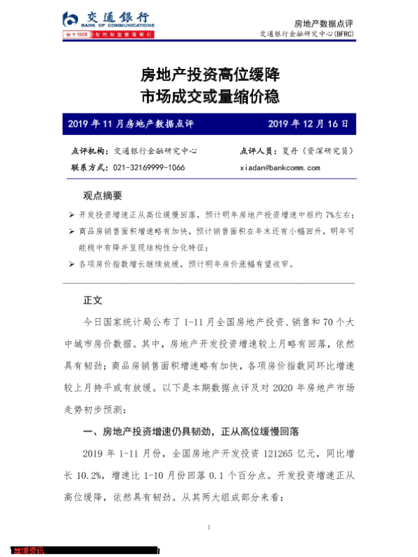 【交通银行金融研究中心】【20191216】2019年11月房地产数据点评-6页