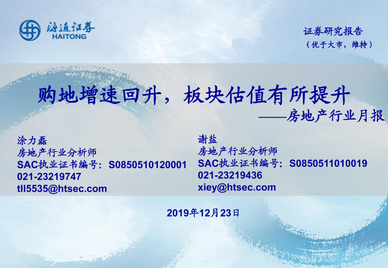 【海通证券】【20191223】房地产行业月报:购地增速回升,板块估值有所提升-18页