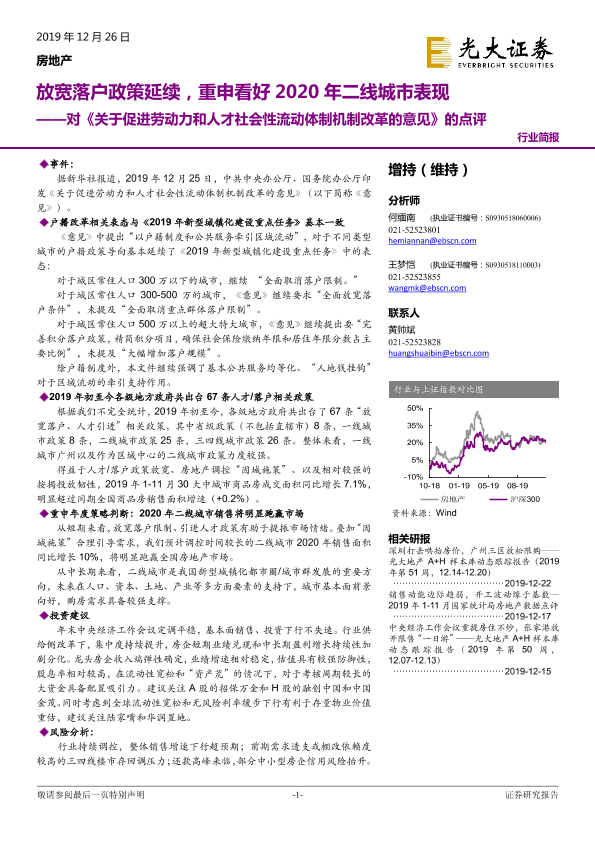 【光大证券】【20191226】对《关于促进劳动力和人才社会性流动体制机制改革的意见》的点评:放宽落户政策延续,重申看好2020年二线城市表现-2页