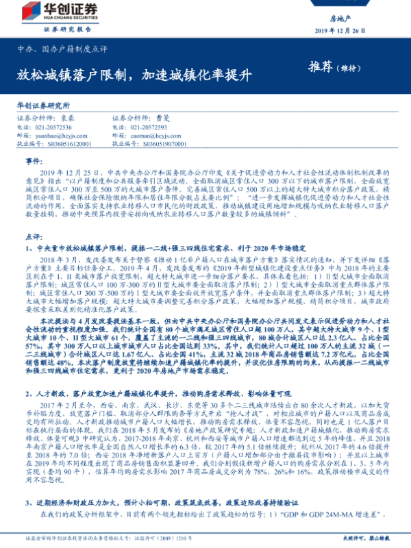【华创证券】【20191226】中办、国办户籍制度点评:放松城镇落户限制,加速城镇化率提升-9页