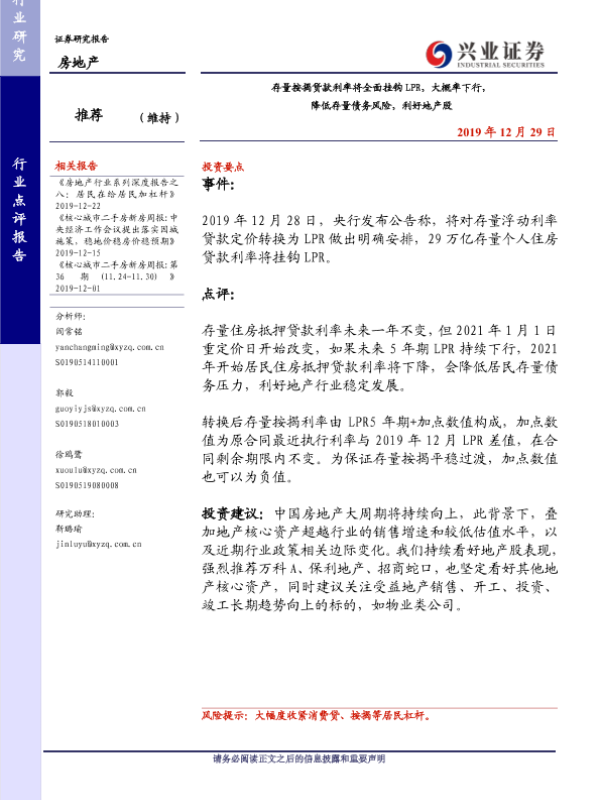 【兴业证券】【20191229】存量按揭贷款利率将全面挂钩LPR,大概率下行,降低存量债务风险,利好地产股-3页