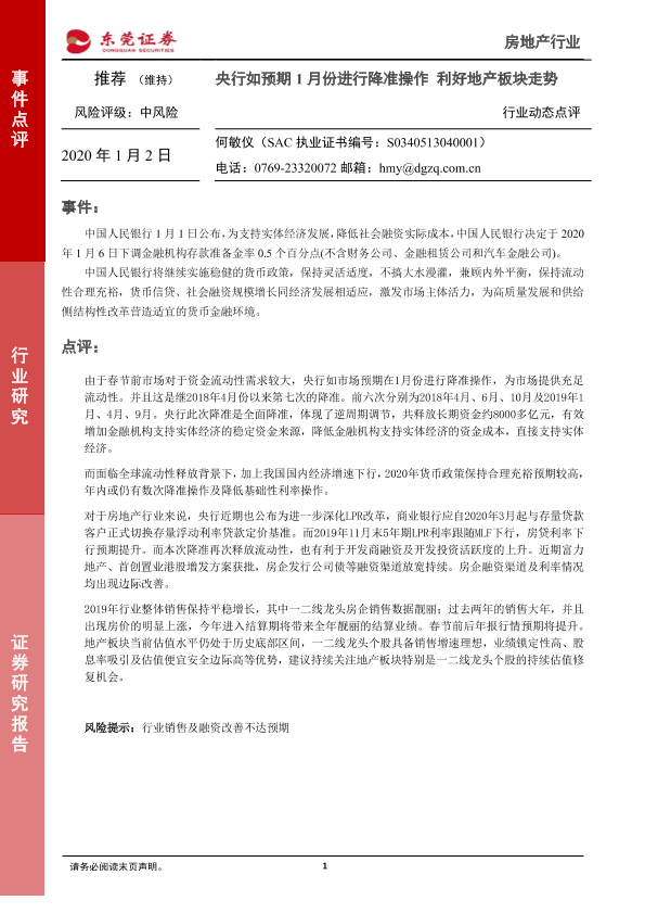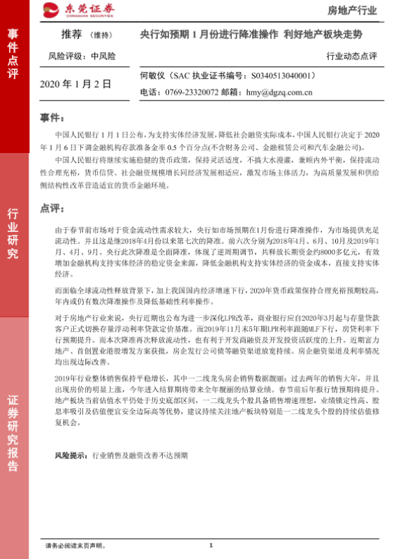 【东莞证券】【20200102】房地产行业动态点评:央行如预期1月份进行降准操作利好地产板块走势-2页