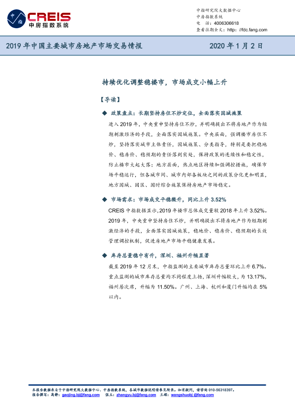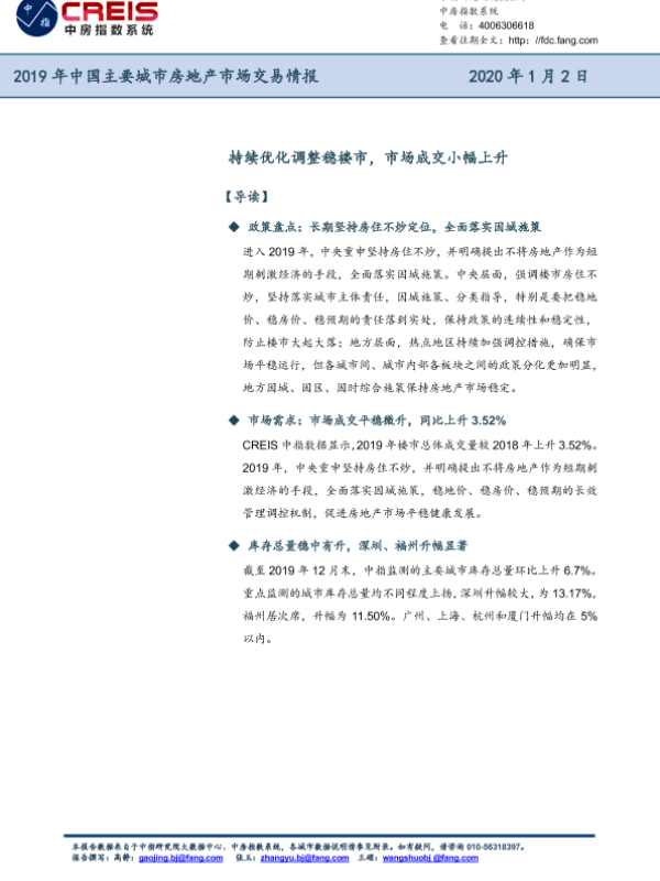 【中指研究院】【20200102】2019年中国主要城市房地产市场交易情报:持续优化调整稳楼市,市场成交小幅上升-7页