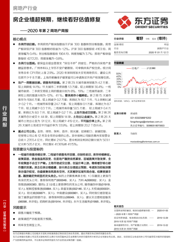 【东方证券】【20200112】2020年第2周地产周报:房企业绩超预期,继续看好估值修复-17页
