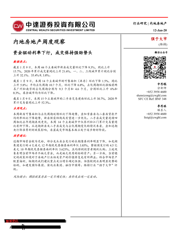【中达证券】【20200112】内地房地产周度观察:资金驱动利率下行,成交保持强劲势头-14页