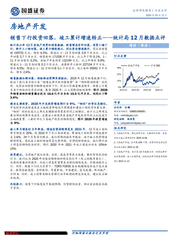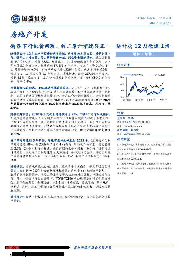 【国盛证券】【20200117】统计局12月数据点评-销售下行投资回落,竣工累计增速转正-9页