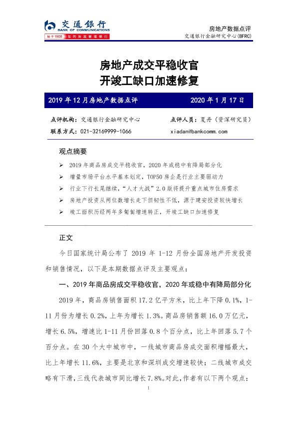 【交通银行金融研究中心】【20200117】2019年12月房地产数据点评:房地产成交平稳收官 开竣工缺口加速修复-7页