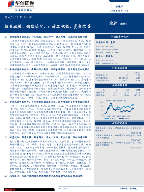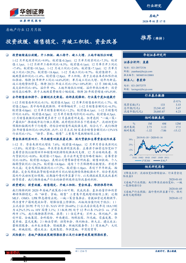 【华创证券】【20200117】房地产行业12月月报:投资放缓、销售稳定、开竣工积极、资金改善-15页