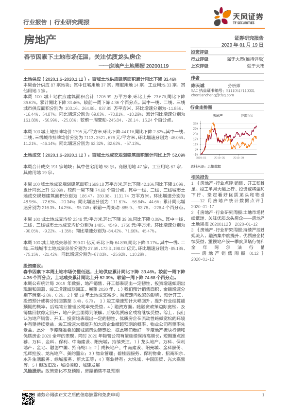 【天风证券】【20200119】春节因素下土地市场低温,关注优质龙头房企-8页