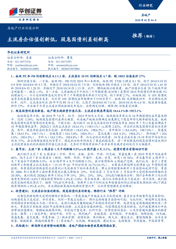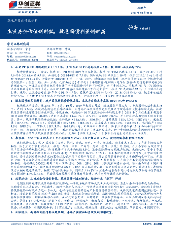 【华创证券】【20200204】房地产行业估值分析:主流房企估值创新低,股息国债利差创新高-9页
