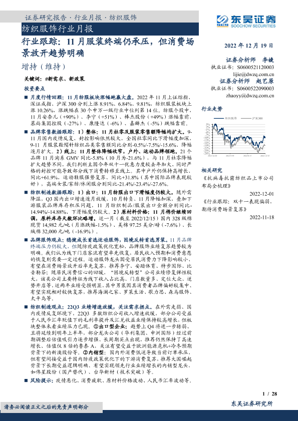 【东吴证券】【20221219】纺织服饰行业月报:行业跟踪,11月服装终端仍承压,但消费场景放开趋势明确-28页
