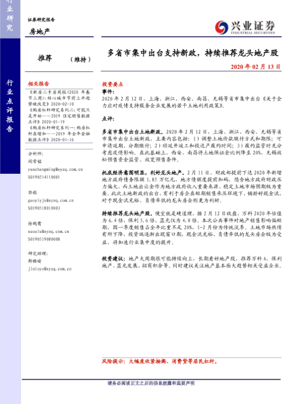 【兴业证券】【20200213】多省市集中出台支持新政,持续推荐龙头地产股-2页