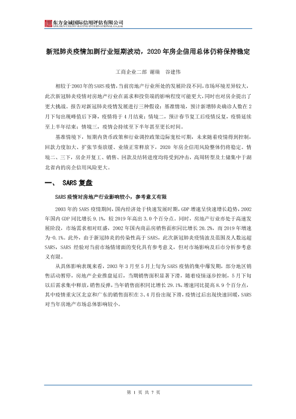 【东方金诚】【20200221】新冠肺炎疫情加剧行业短期波动 2020年房企信用总体仍将保持稳定-7页