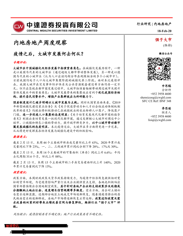【中达证券】【20200218】内地房地产周度观察:疫情之后,大城市发展何去何从?-19页