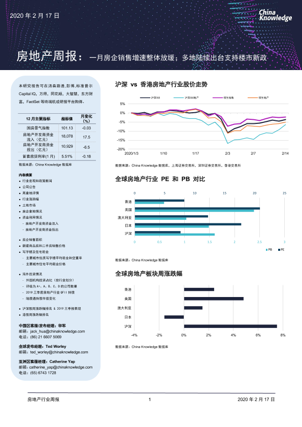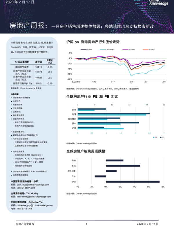 【China Knowledge】【20200217】房地产周报:一月房企销售增速整体放缓;多地陆续出台支持楼市新政-20页