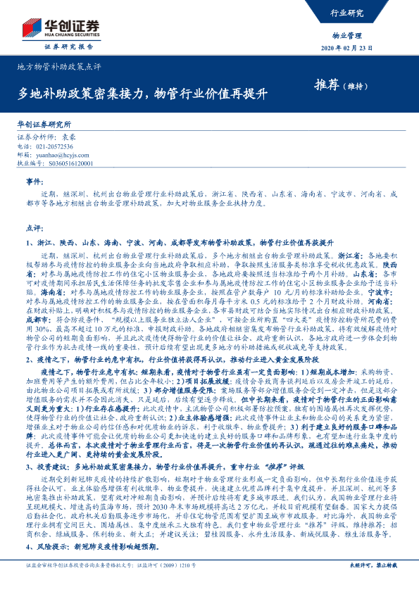 【华创证券】【20200223】地方物管补助政策点评:多地补助政策密集接力,物管行业价值再提升-7页