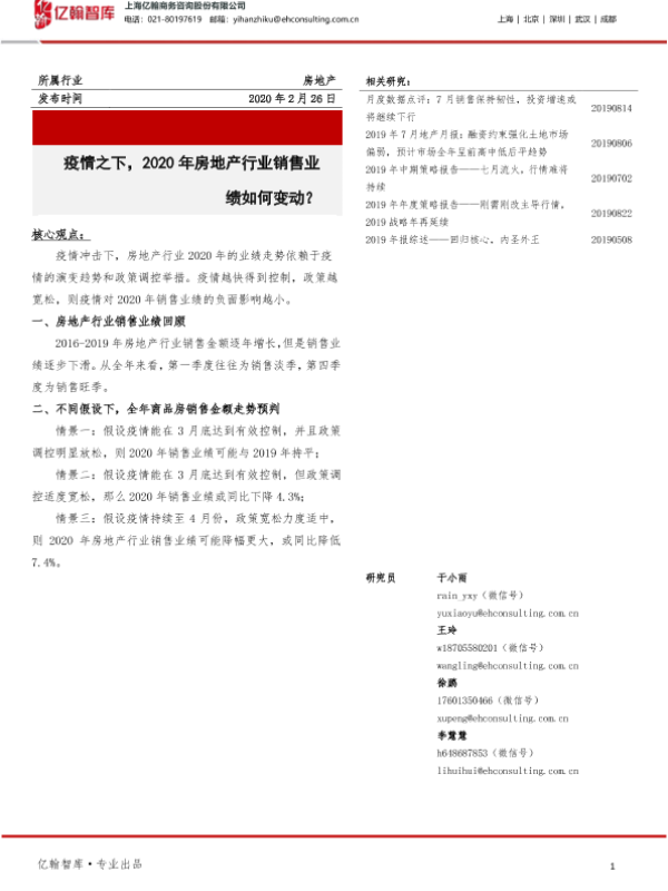 【上海亿翰商务咨询股份有限公司】【20200226】疫情之下,2020年房地产行业销售业绩如何变动?-7页