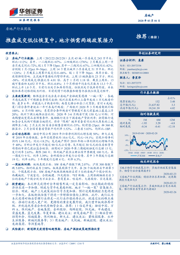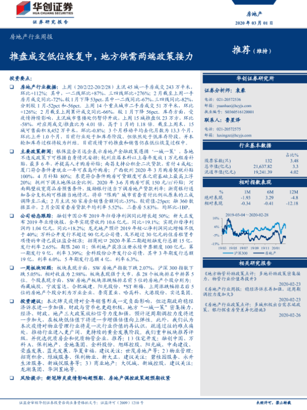【华创证券】【20200301】房地产行业周报:推盘成交低位恢复中,地方供需两端政策接力-22页