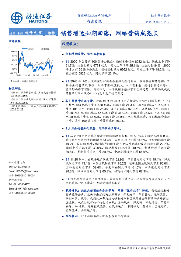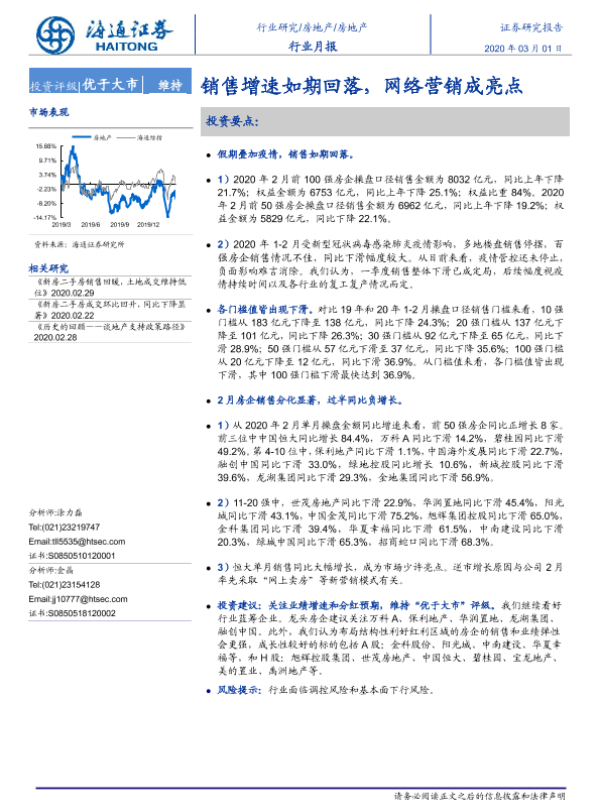 【海通证券】【20200301】房地产行业月报:销售增速如期回落,网络营销成亮点-9页