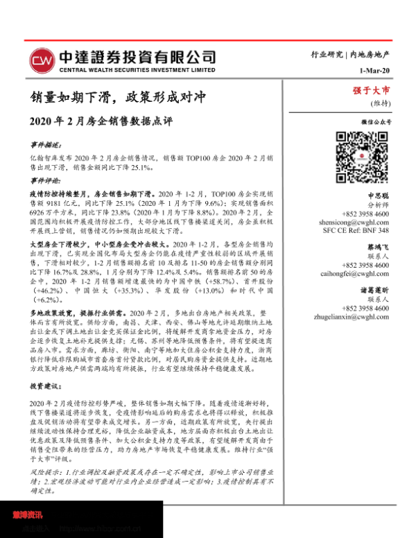 【中达证券】【20200301】2020年2月房企销售数据点评:销量如期下滑,政策形成对冲-10页