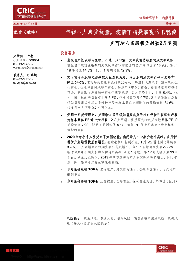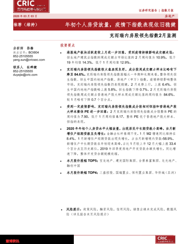 【克而瑞证券】【20200303】内房股领先指数2月监测:年初个人房贷放量,疫情下指数表现依旧稳健-12页