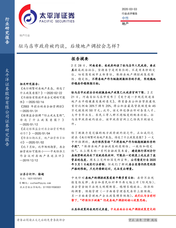 【太平洋证券】【20200303】驻马店市政府被约谈,后续地产调控会怎样?-6页