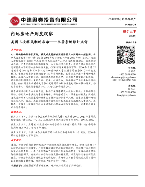 【中达证券】【20200309】内地房地产周度观察:美国三次移民潮的启示——永居条例修订点评-28页