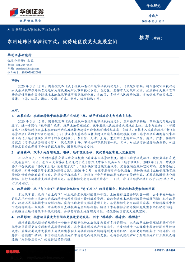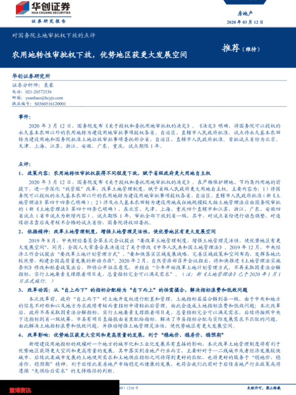 【华创证券】【20200312】对国务院土地审批权下放的点评:农用地转性审批权下放,优势地区获更大发展空间-21页