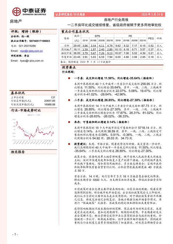 【中泰证券】【20200314】房地产行业周报:一二手房环比成交继续修复,省级政府被赋予更多用地审批权-18页