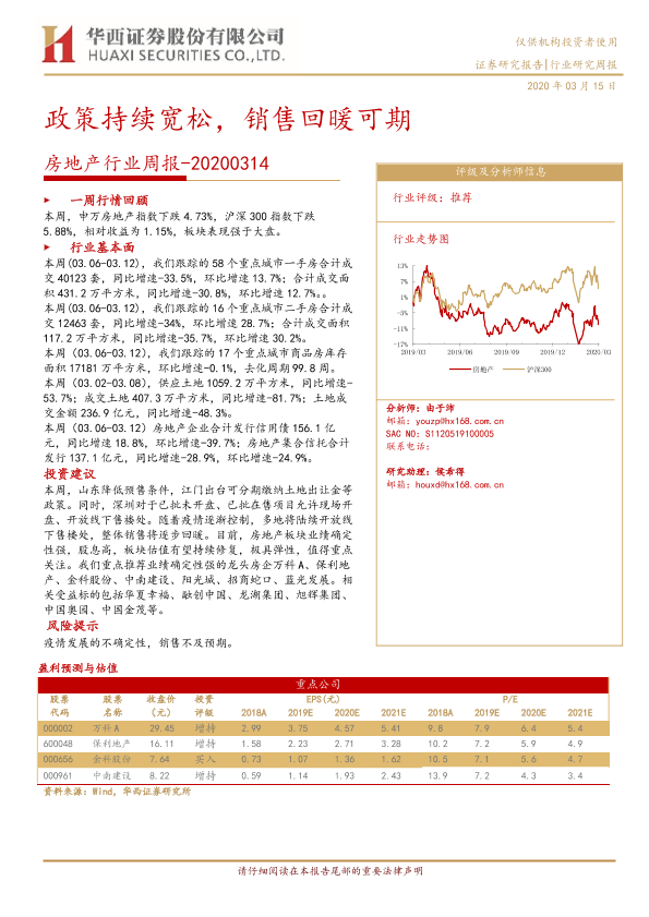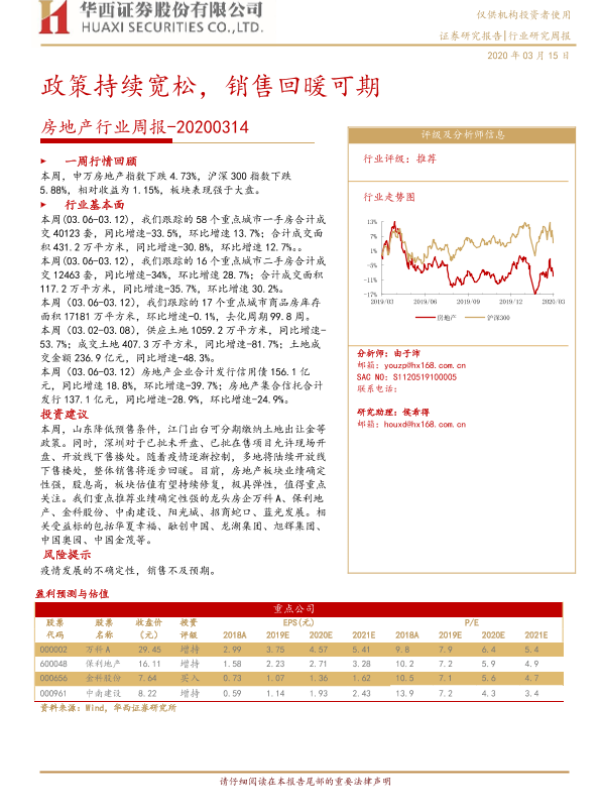 【华西证券】【20200315】房地产行业周报:政策持续宽松,销售回暖可期-22页