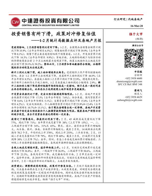 【中达证券】【20200316】1-2月统计局数据点评及房地产月报:投资销售有所下滑,政策对冲修复估值-26页