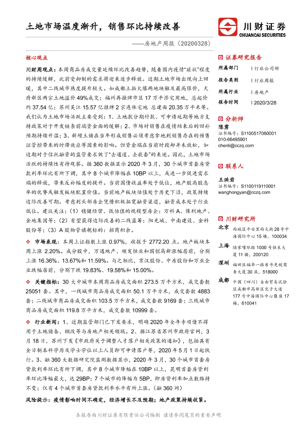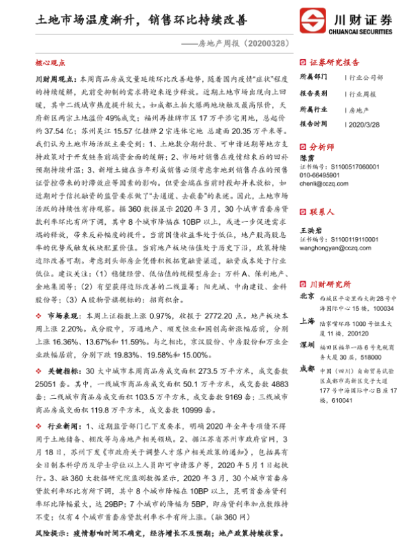 【川财证券】【20200328】房地产周报:土地市场温度渐升,销售环比持续改善-12页