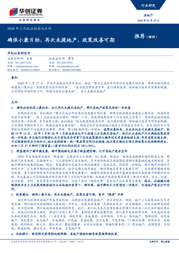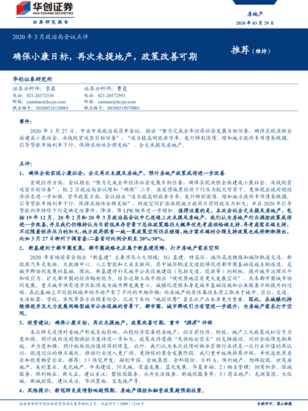 【华创证券】【20200329】房地产2020年3月政治局会议点评:确保小康目标,再次未提地产,政策改善可期-13页