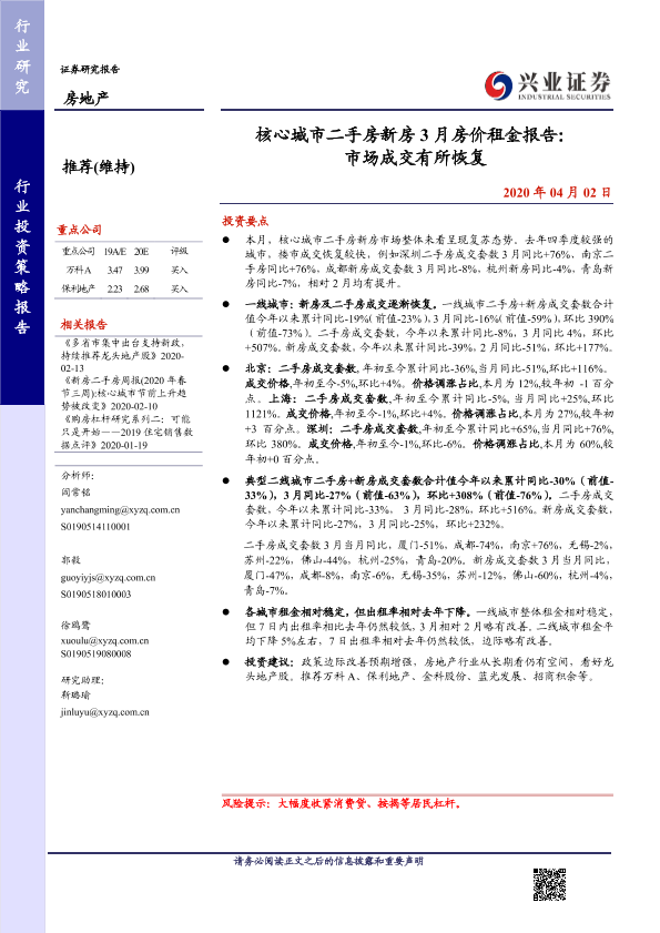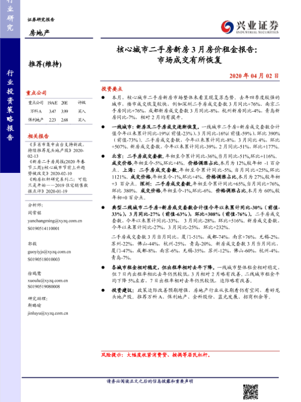 【兴业证券】【20200402】核心城市二手房新房3月房价租金报告:市场成交有所恢复-17页