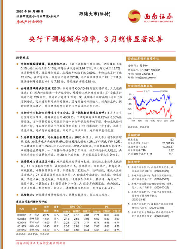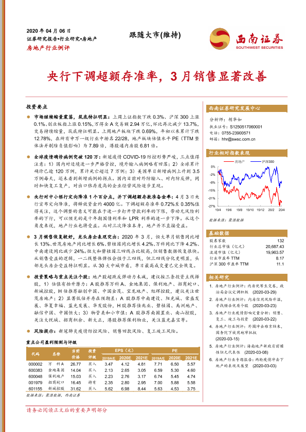 【西南证券】【20200406】房地产行业例评:央行下调超额存准率,3月销售显著改善-20页