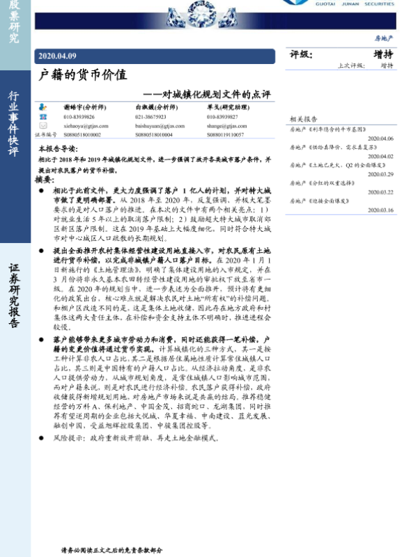 【国泰君安证券】【20200409】对城镇化规划文件的点评:户籍的货币价值-3页